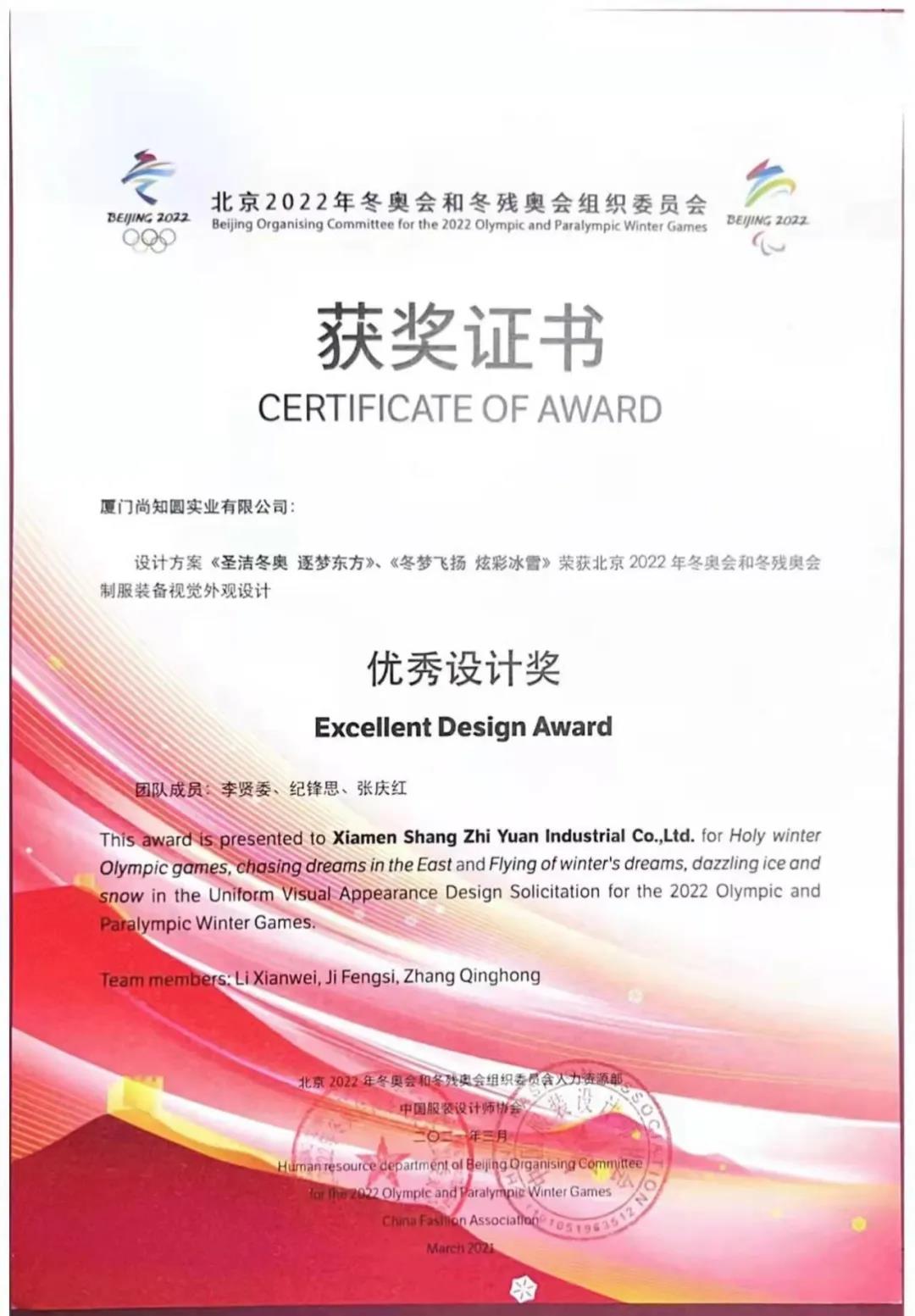 近日,我校2010届服装设计与工程专业校友纪锋思,收到了北京2022年冬奥会、冬残奥会组织委员会人力资源部和中国服装设计师协会颁发的获奖证书。