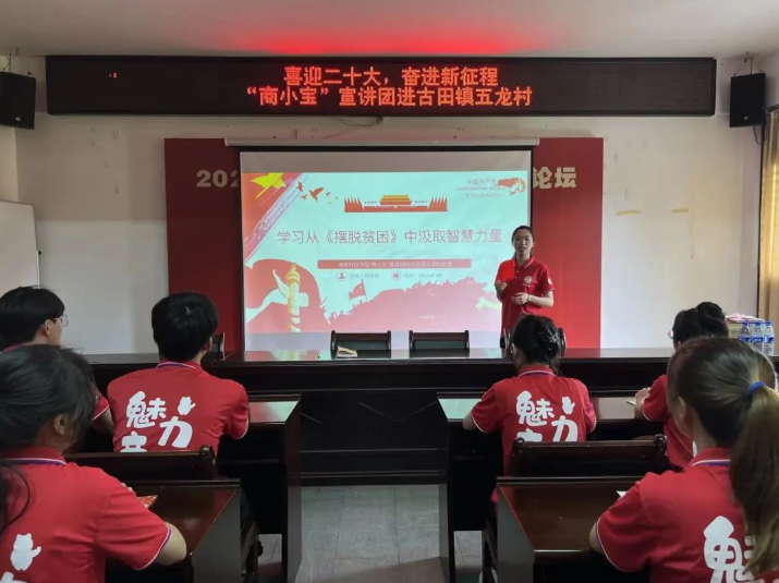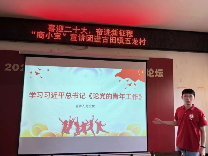 “商小宝”宣讲团社会实践队到古田镇五龙村开展“喜迎二十大,奋进新征程”主题宣讲,五龙福村的村干部以及村民参加了宣讲会。