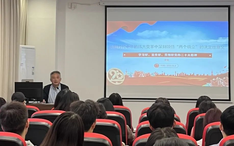 校党委书记李旭以《从新时代十年的伟大变革中深刻领悟“两个确立”的决定性意义——学习好、宣传好、贯彻好党的二十大精神》为题,从党的二十大、过去五年的工作和新时代十年的伟大变革,深刻领悟“两个确立”的决定性意义三个方面,联系党的十八大、十九大报告和习近平总书记系列重要讲话精神,介绍了党的二十大报告主要精神,着重解读了党的二十大报告中的新表述、新概括、新论断,重点阐释了过去五年的工作和新时代十年的伟大变革,引导同学们在学习中深刻领悟党确立习近平同志党中央的核心、全党的核心地位,确立习近平新时代中国特色社会主义思想的指导地位,反映了全党全军全国各族人民共同心愿,对新时代党和国家事业发展、对推进中华民族伟大复兴历史进程具有决定性意义。