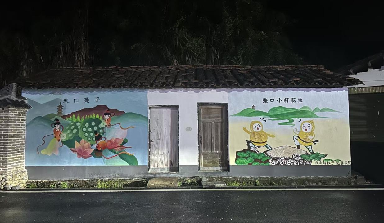 在泰宁县王坑村,实践队以“助力乡村产业发展,赋能乡村振兴”为题开展墙绘实践活动。实践队成员充分发挥学科优势与专业特长,用画笔描绘美丽乡村。在一勾一点、一笔一画中,泰宁县独有的“朱口莲子”、“朱口小籽花生”等品牌形象跃然于墙,为王坑村增添生机与活力,助力美丽乡村建设。