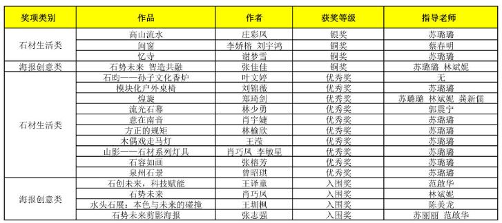 近日,水头世界石都首届艺术设计大奖赛获奖结果公布,我校学子经过激烈的角逐,分别荣获石材生活类银奖1项,石材生活类铜奖2项,海报创意类铜奖1项,石材生活类优秀奖10项,海报创意类入围奖4项的好成绩。