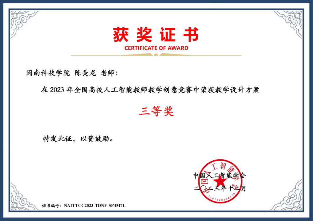 近日,首届全国高校人工智能教师教学创意竞赛全国决赛公布获奖名单,我校计算机信息学院教师陈美龙的《C语言程序设计》教学设计参赛作品荣获“教学设计方案类”三等奖。