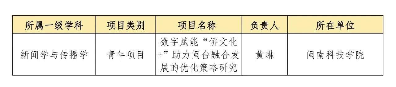 近日,福建省社会科学规划办公室公布了2024年度福建省社会科学基金项目立项名单,我校艺术设计学院黄琳老师申报的课题成功获得立项。