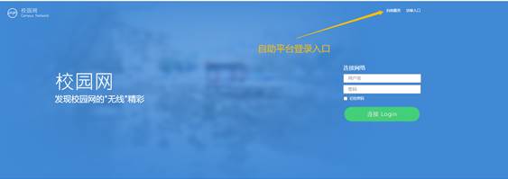用户如已登录校园网,则可通过学校官网首页(https://www.saleshouse-deutschland.com)底部的“校园网自助”导航按钮访问校园网自助服务网站,如下图所示。在登录界面,输入校园网账号及密码,点击登录。