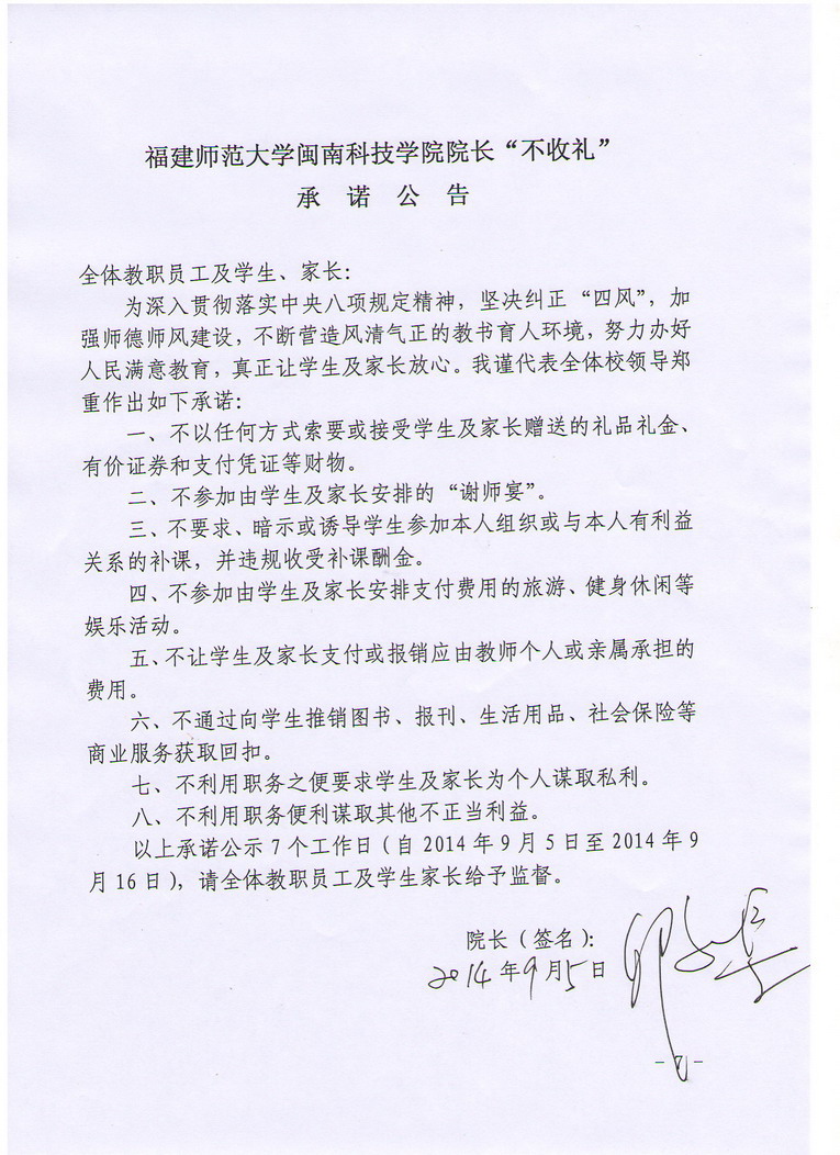 福建师范大学乐鱼官方网页版院长“不收礼”承诺公告